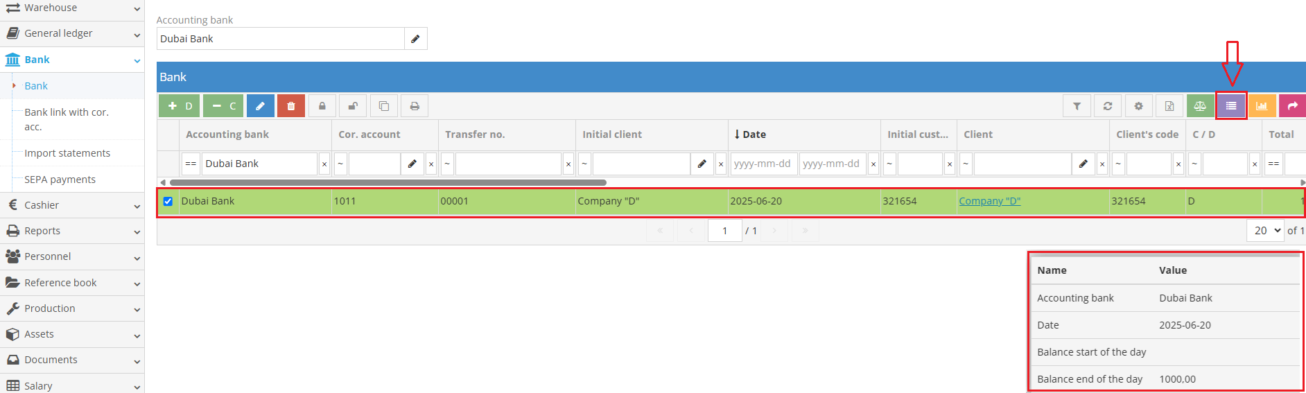 • bank bank select the entry for the date you want to see the balance for, and click the bank balance button.a new table will appear on the right side of the screen showing the bank balance.to hide the balance from the table, don t forget to click the same button again..
