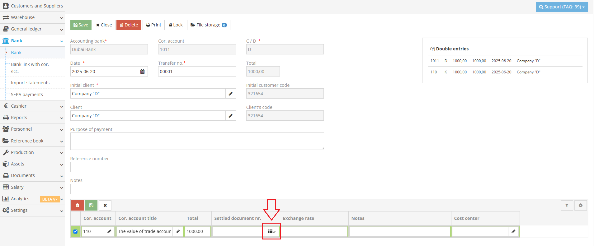 • bank bank to select a document for settlement when registering received payments or disbursed funds, you first need to enter the amount, and only then click the settled document nr. button . note: the settlement amount cannot be greater than the outstanding balance of the document being settled..