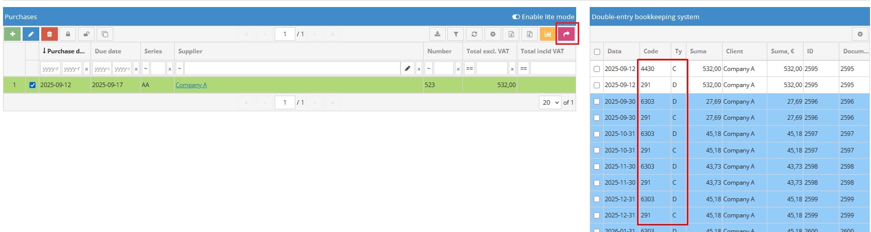 • warehouse purchases sequence of actions:1. create a purchase entry 2. select the purchase item 3. click the allocation button 4. in the opened window, fill in the fields and click generate : period from the entry date is filled in automatically, but can be changed if needed. period until the date up to which the amount should be allocated. allocate over period select the allocation frequency: monthly, quarterly, or yearly. corresponding account select the account to which the amounts will be allocated to delete allocated future expenses select the purchase item and click the delete allocated future expenses button.. you can check the expense allocation in the main purchase entry window by clicking the show/hide double-entry records button. note: if a cost center is assigned in the purchase entry, it will also be applied during the allocation of future expenses. expenses are distributed based on the number of days in the selected period, not by month. therefore, the allocated expense amount may vary from month to month depending on the number of days in each month. the calculation formula used: total future expense amount is divided by the number of days in the selected period and multiplied by the number of days in the month (in which the expenses are allocated)..