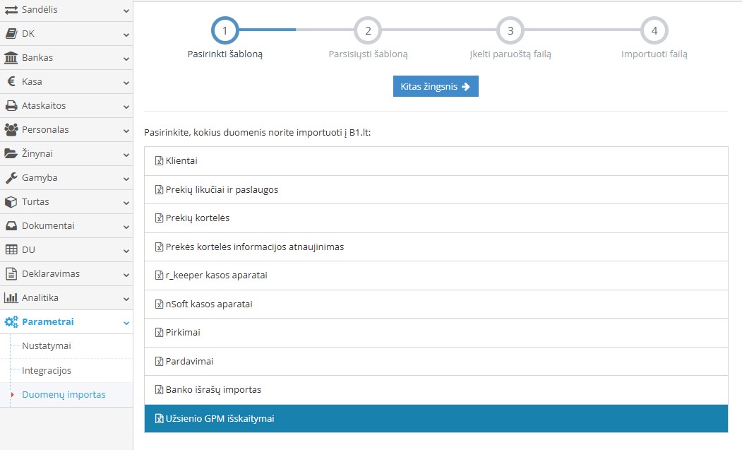 Užpildyti parsisiųstą šabloną Excel formatu. Laukų reikšmių paaiškinimai nurodyti Site.pro apskaitos programoje ir excel šablone. Spausti ant rodyklės „Kitas žingsnis”.