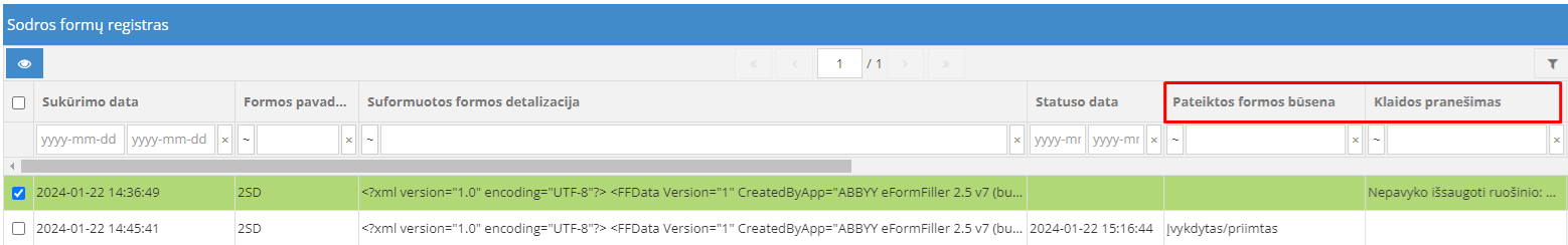 Informaciją apie pateiktą ataskaitos formą sodrai galima stebėti Sodros formos registre stulpelyje „Pateiktos formos būsena“. Jei pateiktame dokumente buvo klaidų, klaidos pranešimas taip pat pateikiamas: